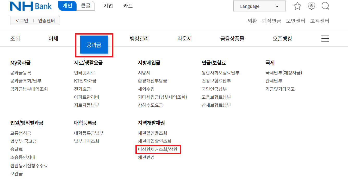 먼저 농협은행 사이트에 접속한 후 탭에서 [공과금]을 선택 후[미상환채권조회]를 선택하시고 로그인하시면 조회하실 수 있습니다.